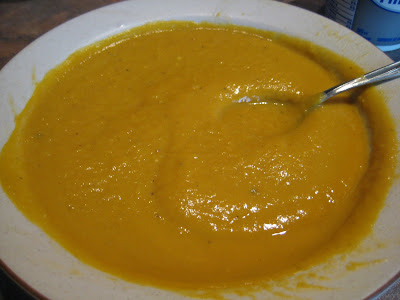 This past weekend I was as sick as a dog with a cold so it was a good thing that I had made a batch of soup beforehand. I always seem to buy sweet potatoes when I am in the grocery store, yet I don't have a lot of recipes that use them. One advantage of sweet potatoes is that they cook much faster compared to potatoes and make a good base for pureed soup. In the pot above there was: