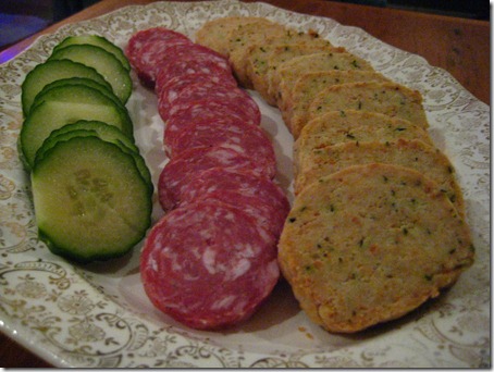 I was really happy with the way these turned out. To accompany them I bought a Rosette de Lyon sausage (cured French sausage) and an English cucumber and cut them in slices and arranged everything on a platter. The Husband poured Prosecco while everyone sat down. The in-laws were suitably impressed with the presentation and loved the crackers. They are really tasty and so easy to make (the crackers, not the in-laws). The texture is a lot like shortbread, albeit a savoury kind. This is a great recipe to use for a party as you can easily make multiple batches and the dough can sit in the fridge for a while and when you need it you just take it out, slice it and bake it. I will most definitively make this again.